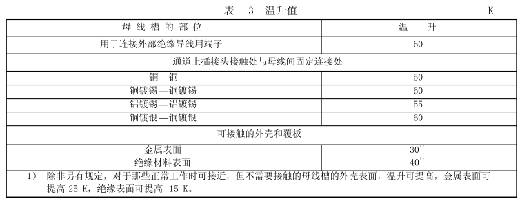 對(duì)母線槽進(jìn)行試驗(yàn),各部位的溫升不應(yīng)超出的規(guī)定。特殊情況下在不影響絕緣材料的絕緣性能和使用壽命時(shí),可適當(dāng)提高溫升值。