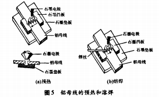 (8)焊工施焊時,焊工頭戴面罩,一手拿焊絲一手拿石墨碳棒,不斷地將現已生成的氧化鋁清出熔池。
