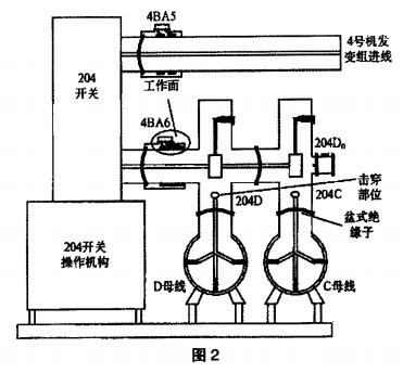 12月6日對電流互感器4BA6B相進行查看處理,票中的安全措施有斷開204開關,拉開204C刀閘、204D刀閘,合204DO地刀等。12月7日,檢修持票將該距離4BA6B相氣窒內(nèi)SF6氣體抽至零表壓后(該氣室內(nèi)還有1個大氣壓的 SF6氣體)。打開B相氣室端蓋,對斷線進行處理后回裝好端蓋,在對氣室抽真空時,報“220kVo母線槽復合電壓動作",“220kVD母線槽維護動作”,銜接于D母線槽上的一切電氣元件全部跳閘,D母線槽失壓。