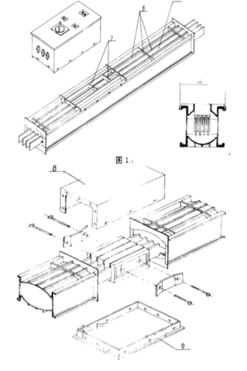 通過對母線槽的改良設(shè)計(jì),在母線槽的蓋板、側(cè)板連接處、插口處、接頭處都設(shè)計(jì)防水結(jié)構(gòu),設(shè)置防水嵌件。如圖1:利用插口處加強(qiáng)筋的凸起部分(7)和插接箱底部的凹槽相配合,以解決插口處的防水問題。如圖2:用接頭防水上罩(8)和接頭防水底板(9)與母線槽相配合,已解決解決接頭處的防水問題。