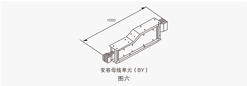 變?nèi)菽妇€主要用于同一系統(tǒng)中不同額定電流單元的連接,以使整個母線槽系統(tǒng)更加經(jīng)濟(jì)實(shí)用。其標(biāo)準(zhǔn)長度為1000mm,也可根據(jù)用戶要求定制尺寸。見圖六